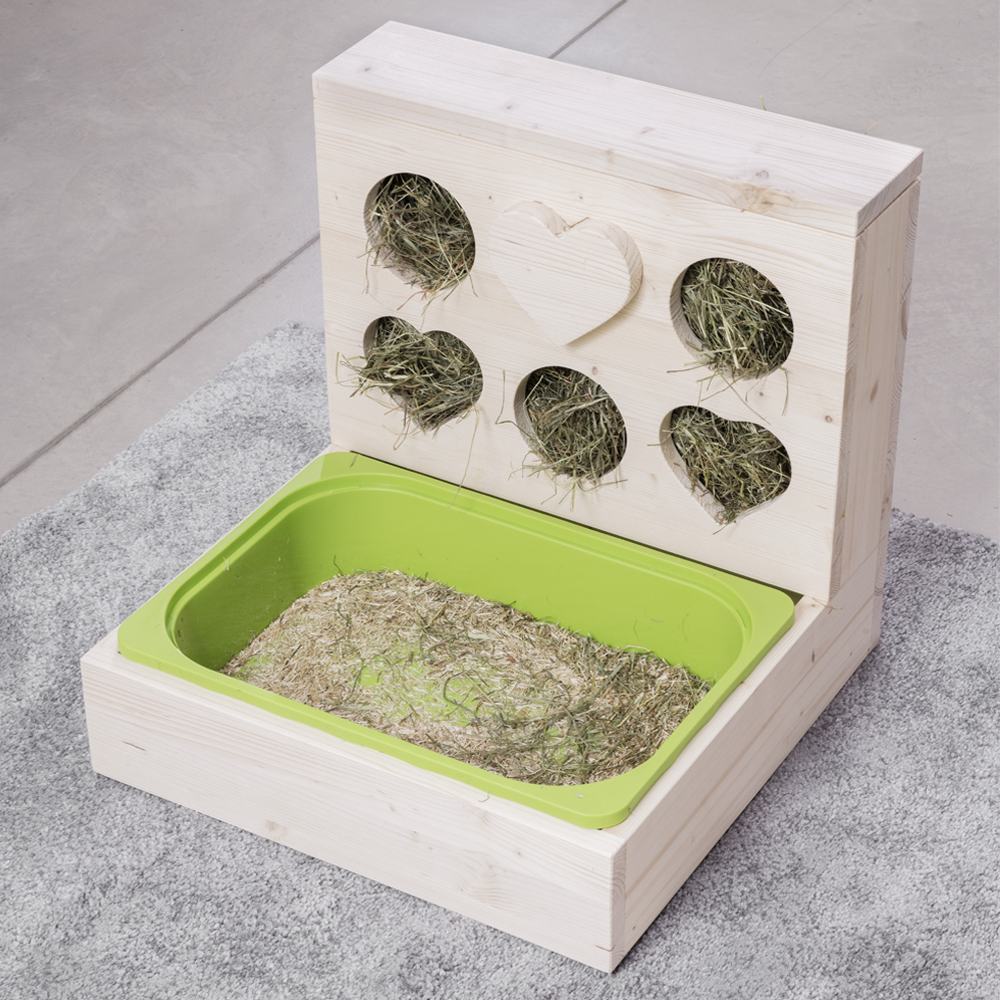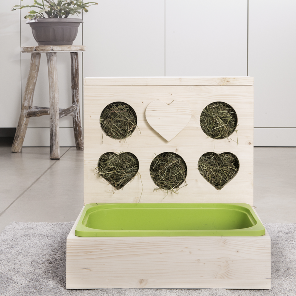 - Materiali: vaschetta in PP, lettiera e fieniera in legno massello di abete spessore 15 mm