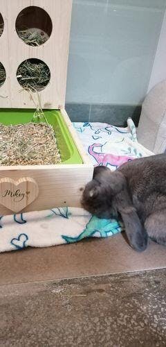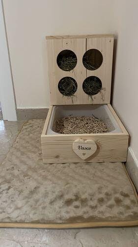 “Un coniglio davvero felice ha una “cameretta” tutta sua, arredata con amore ed attenzione ❤︎ Un vero Bunnylover lo sa: ogni coniglietto molto amato merita uno spazio speciale, pensato per mangiare e fare i bisogni nello stesso momento 😉”