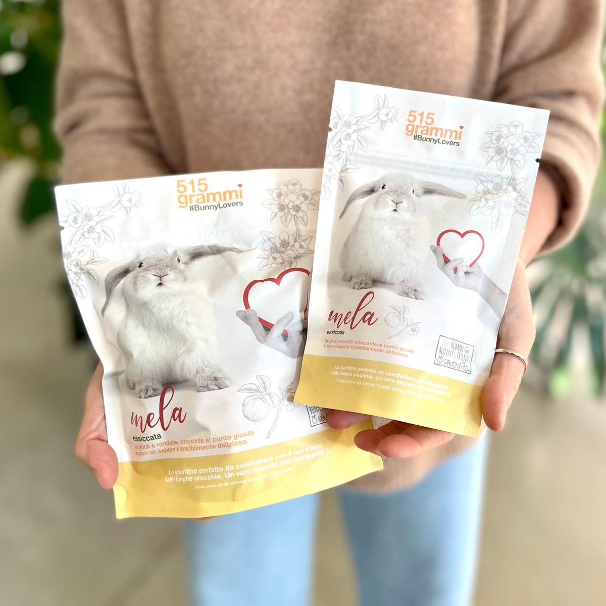“Sebbene il coniglio non debba assumere zuccheri, ogni tanto ha bisogno di gratificazioni, quindi meglio selezionare solo prodotti di ottima qualità, possibilmente naturali dei quali, quando è possibile, si conosce la provenienza. La nostra mela deve essere il “Mai-Più-Senza” del Bunnylover che desidera prendersi cura del pancino del suo coniglio anche quando lo sta viziando. Per esempio, a me, che sono un’umana, piace sgranocchiarla come snack davanti alla televisione, mentre ai miei piccoli amici la aggiungo al fieno quando voglio incentivare il loro naturale istinto alla ricerca. La domenica poi sono felice di condividerla con loro per una ricca e golosa colazione di gruppo… questo è il nostro segreto per vivere insieme in armonia, prenderci cura della reciproca felicità, ognuno a modo suo e nel massimo rispetto dell’altro.”