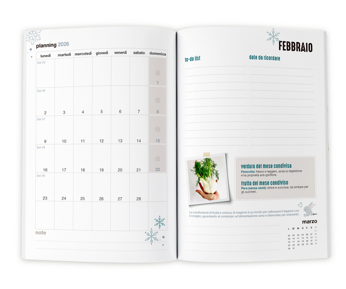 L’Agenda 515grammi 2026 è l’agenda quotidiana pensata per chi convive con uno o più conigli: 365 giorni di spazi da scrivere, planning mensile, consigli stagionali, frutta e verdura del mese, routine di cura e piccole Bunnycuriosità.